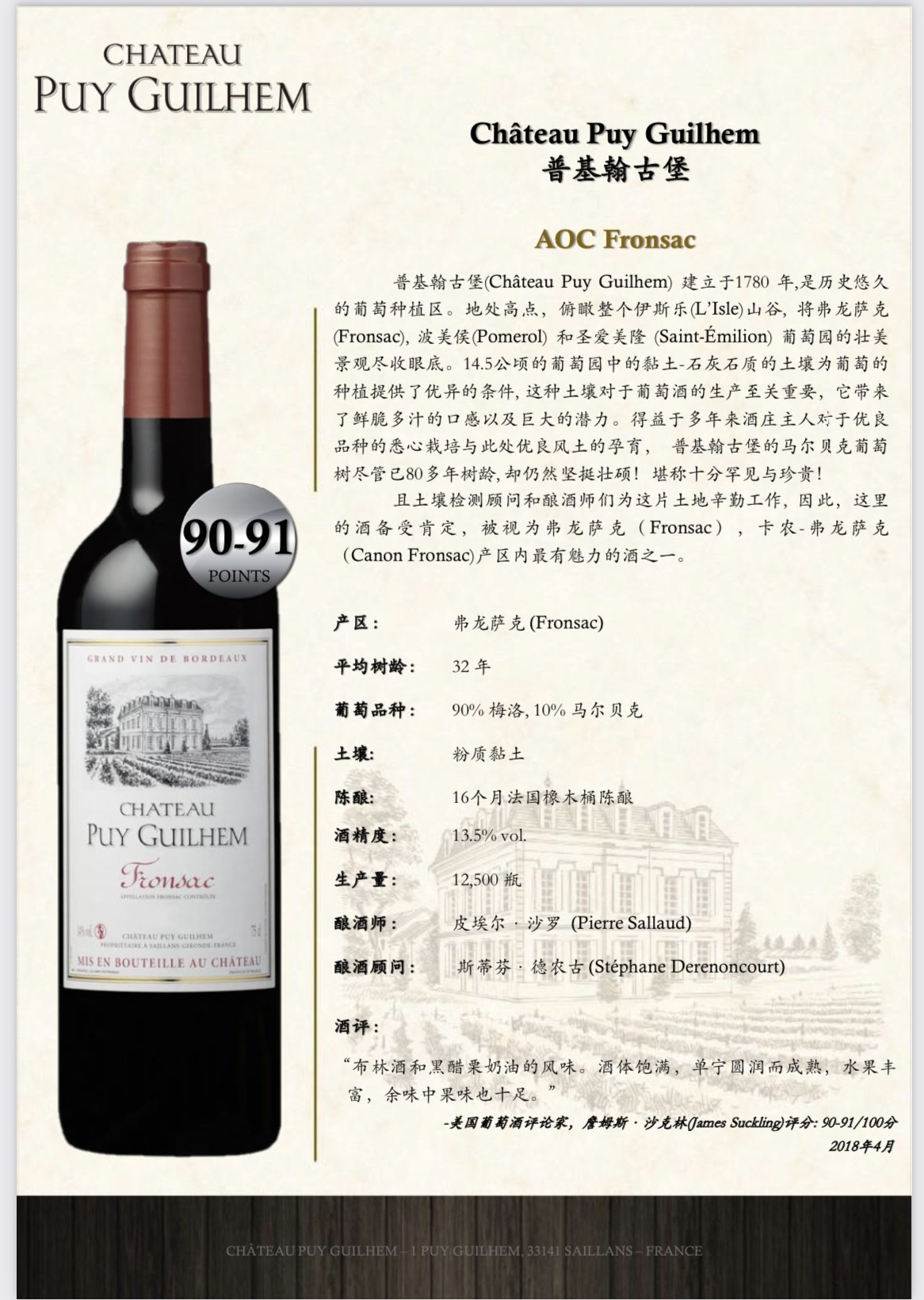 • 酒庄名称:Chateau Puy Guilhem