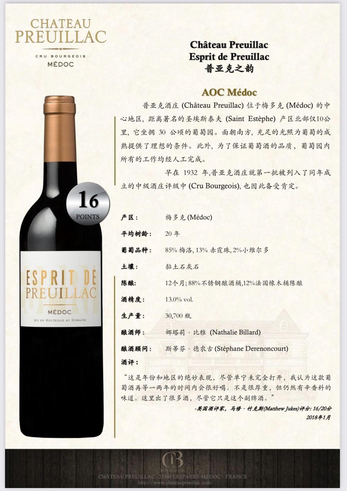 • 酒庄名称:ESPRIT DE PREULLAC