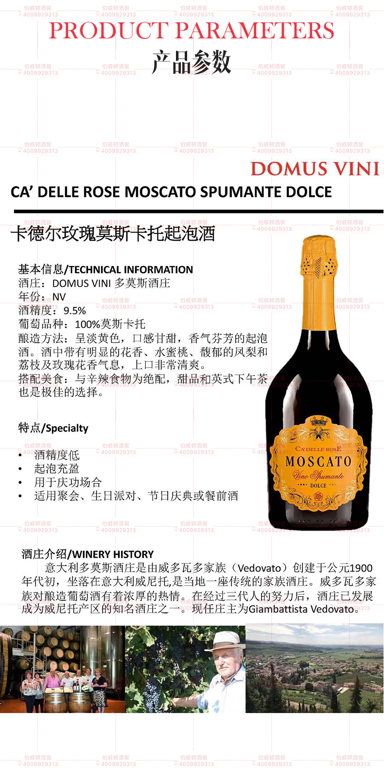 • 酒庄名称:CA DELLE ROSE MOSCATO SPUMANTE DOLCE